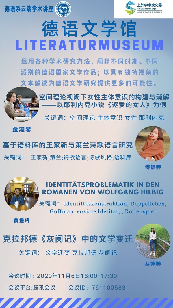SISU云端学术角第十三期由教务处主办,由德语系承办,将于11月6日(周五)16:00准时开启!本期活动以「德语文学馆」为主题,运用各种开云电竞官网下载方法,阐释不同时期、不同派别的德语国家文学作品;以具有独特视角的文本解读为德语文学研究提供更多的可能性。