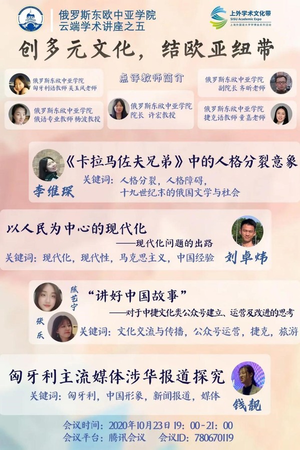 SISU云端学术角第十一期活动由教务处主办,由俄罗斯东欧中亚学院承办,将于10月23日(周五)19:00准时开启! 本期活动中,主讲学生和点评嘉宾们将围绕“创多元文化,结欧亚纽带”这一主题,展开文化交流与研究成果分享。