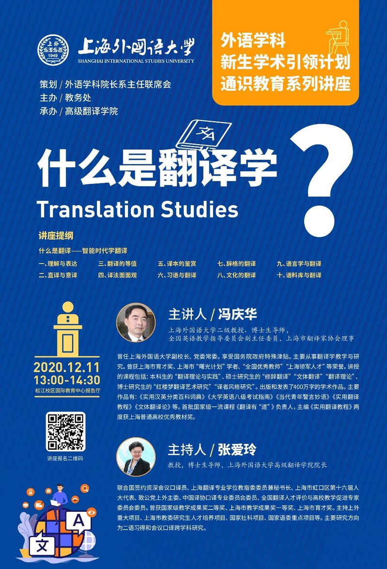 【编者按】为积极推进“多语种+”办学战略,突出“会语言、通国家、精领域”,帮助外语学科新生从一开始就了解本学科的知识体系和研究领域,提升外语能力,掌握基本的开云电竞官网下载方法,学校特邀资深学者举办“外语学科新生学术引领计划”通识教育系列讲座。2020年12月11日,第七期外语学科新生学术引领计划通识教育系列讲座在上外松江校区成功举办,冯庆华教授为大家分享:什么是翻译学。讲座由高级翻译学院院长张爱玲教授主持。