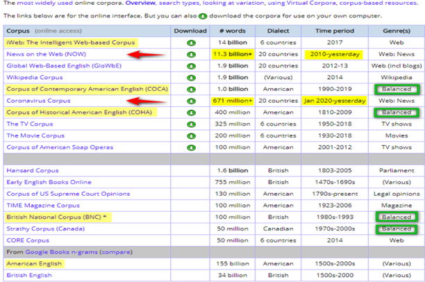 1.英语语料库(https://www.english-corpora.org/):包含BNC(British National Corpus)、COCA(Corpus of Contemporary American English)、COHA(Corpus of Historical American English)、iWeb(The Intelligent Web-based Corpus)等不同语料网站。