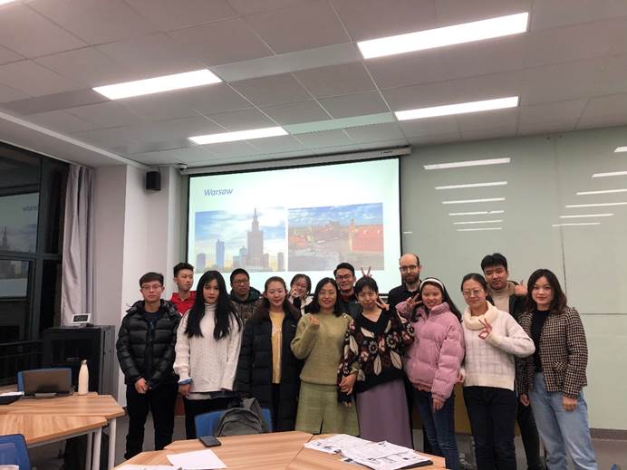 波兰语外教Tomasz Ewertowski带领同学们学习了波兰语基础会话、名词变格、动词变位等语言知识,也感受了波兰历史、美食、节日等风土人情。以波兰语字母表入门,再到“您好”“你叫什么名字”“谢谢”“不客气”的简单会话,再到询问事物名称、时间、地点等,结合每次课最后半小时的波兰音乐、美食、动画等文化介绍,课程内容循序渐进,层次分明。外教老师还寓教于乐,利用小游戏帮助同学们记忆动词变位,比如在“找东西”游戏中锻炼“什么在哪里”句型;还鼓励学生们大胆开口,大声朗读,并强调“站起来”交流,帮助同学们迅速掌握所学内容。每周的课程结束后,助教都会根据同学们的课后提问和反馈积极和老师沟通,努力解决同学们在学习中遇到的问题,并在blackboard平台上上传资料,帮助学生课后复习和拓展。