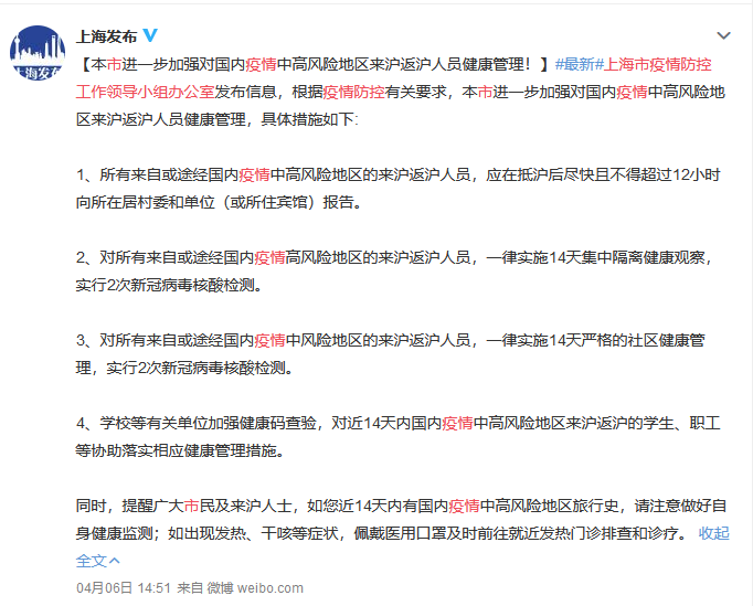上海市4月6日发布国内疫情中高风险地区来沪返沪人员健康管理要求,请考生充分知晓,提高重视,避免不必要的经济损失。详情查阅“上海发布”微信公众号。请考生持续关注上海市防疫要求。