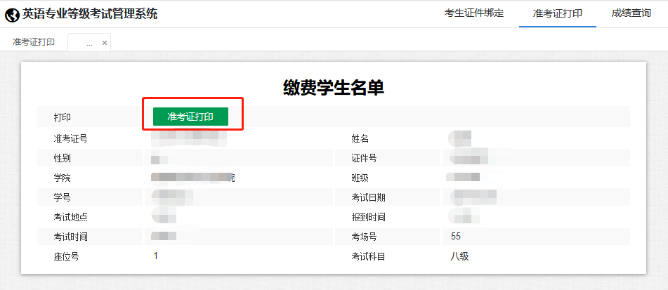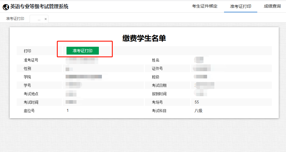5. 核实本人信息,无误后点击“准考证打印”。
