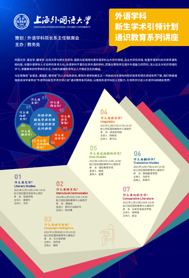 讲座由外语学科院长系主任联席会发起,教务处主办,英语学院、德语系、东方语学院、语言研究院、国际教育学院、高级翻译学院、日本文化经济学院等学院轮流承办,自2021年11月12日起,每周五在上外松江校区举办,面向以新生为主的全校学生开放,包含文学、跨文化、语言智能、语言学、区域国别研究、翻译学、比较文学等7个专题。目前,2021年7场系列讲座已全部结束,共邀请15位知名专家学者与大学新生分享他们的认识、感悟和观点,帮助学生提升外语能力,了解外语学科相关知识,掌握基本的开云电竞官网下载方法。