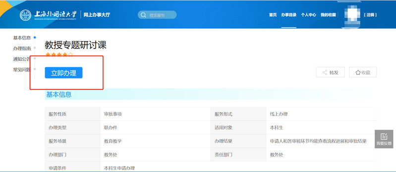 进入开云电竞注册流程网上办事大厅(网址:ehall.shisu.edu.cn),选择业务部门为教务处分类下“教授专题研讨课”模块,通过统一身份认证登录后,点击“立即办理”。