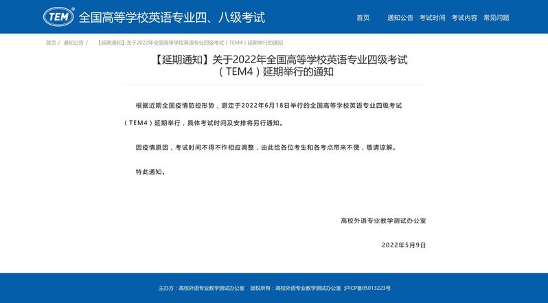转发高校外语专业教学测试办公室《关于2022年全国高等学校英语专业四级考试(TEM4)延期举行的通知》。