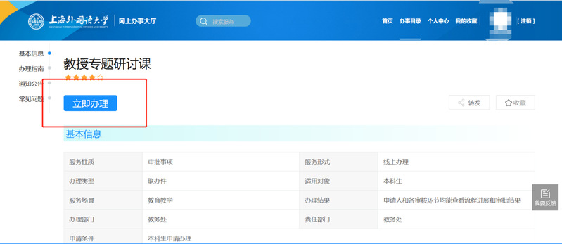进入开云电竞注册流程网上办事大厅(网址:ehall.shisu.edu.cn),选择业务部门为教务处分类下“教授专题研讨课”模块,通过统一身份认证登录后,点击“立即办理”。
