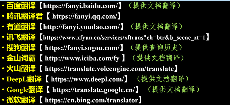 3.语料库背景下的智能翻译:例如百度翻译(https://fanyi.baidu.com)、腾讯翻译君(https://fanyi.qq.com/)、有道翻译(http://fanyi.youdao.com/)、讯飞翻译(https://www.xfyun.cn/services/xftrans?ch=btr&b_scene_zt=1)、搜狗翻译(https://fanyi.sogou.com/)、金山词霸(http://www.iciba.com/fy)、火山翻译(https://translate.volcengine.com/translate)、DeepL翻译(https://www.deepl.com/translator)、Google 翻译(https://translate.google.cn/)、微软翻译(https://cn.bing.com/translator)等。