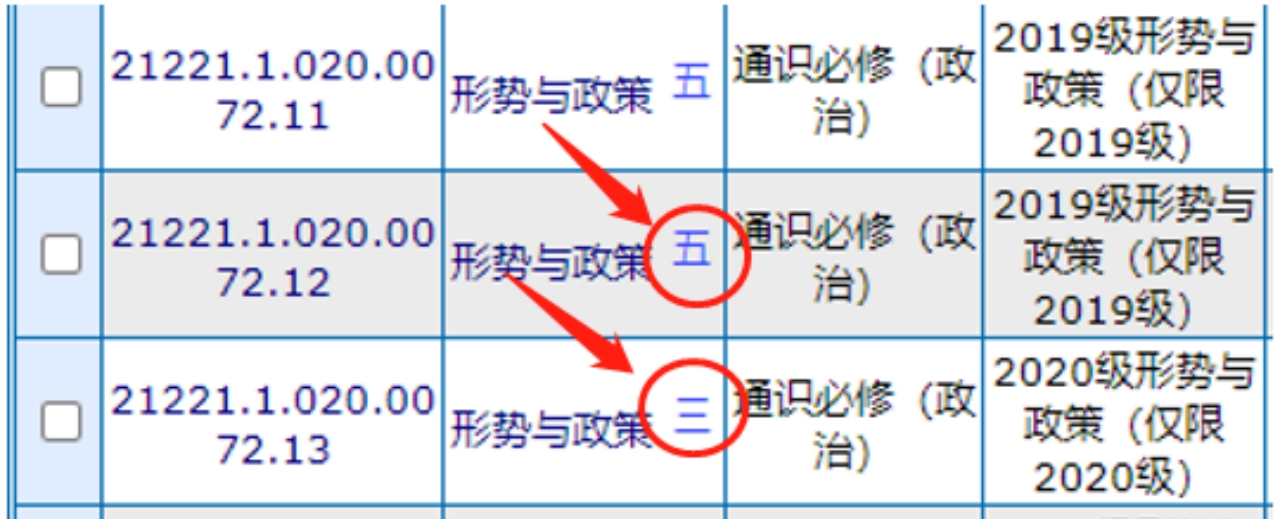 (3)“形势与政策”为1-8学期连续课程,每学期8学时,请同学们注意上课时间,按时选课,留意课程名称右侧的对应数字;