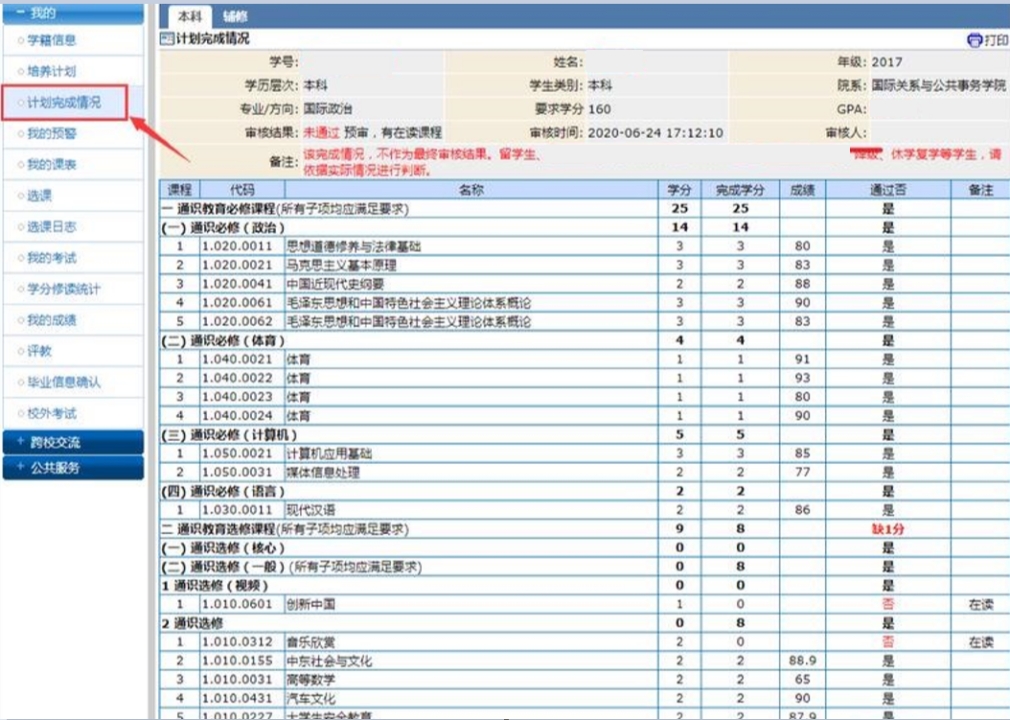 (2)选课前和选课过程中,请仔细研究自己的计划完成情况,参照 “我的”—“计划完成情况”如下图: