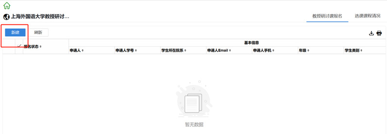 点击“新建”在线填写信息,系统会自动根据学生类别和年级确定研讨课级别,请补填其他所需信息,确认无误后点击报名申请(每人只能提交一次,限选一门,提交后无法修改,但可以查看)。