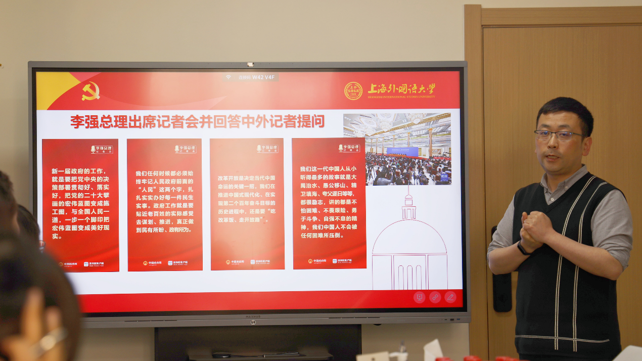徐旻以“立足本职,砥砺前行”为题,从2023年全国“两会”的重要时间节点切入,解读了“两会”的基本背景、各项议程和主要精神。他指出,“两会”的胜利召开,为全国人民踏上新征程、奋楫新时代,凝聚了磅礴伟力、锚定了奋斗目标。习近平总书记在参加江苏省代表团审议时发表重要讲话,强调高质量发展是全面建设社会主义现代化国家的首要任务,推动高质量发展,必须坚持和加强党的全面领导、坚定不移全面从严治党。徐旻认为,作为外语教师,我们要深入学习贯彻全国“两会”精神,挖掘其中蕴含的思想政治教育资源,如《政府工作报告》多语种版本语料,如李强总理在回答中外记者提问时提及大禹治水、愚公移山、精卫填海、夸父逐日等中华经典故事,正是中华民族迎难而上、百折不挠精神的体现。这些都是推进课程思政改革的绝佳素材。徐旻强调,作为教学管理行政部门工作人员,我们“坐在办公室碰到的都是问题,深入基层看到的全是办法”,更应坚持立德树人根本任务,立足本职工作,多到院系摸排、调研存在的困难和需求,发现“真问题”,找到“真办法”,切实为学校师生做好教学管理和服务工作,把“两会”精神落到实处。