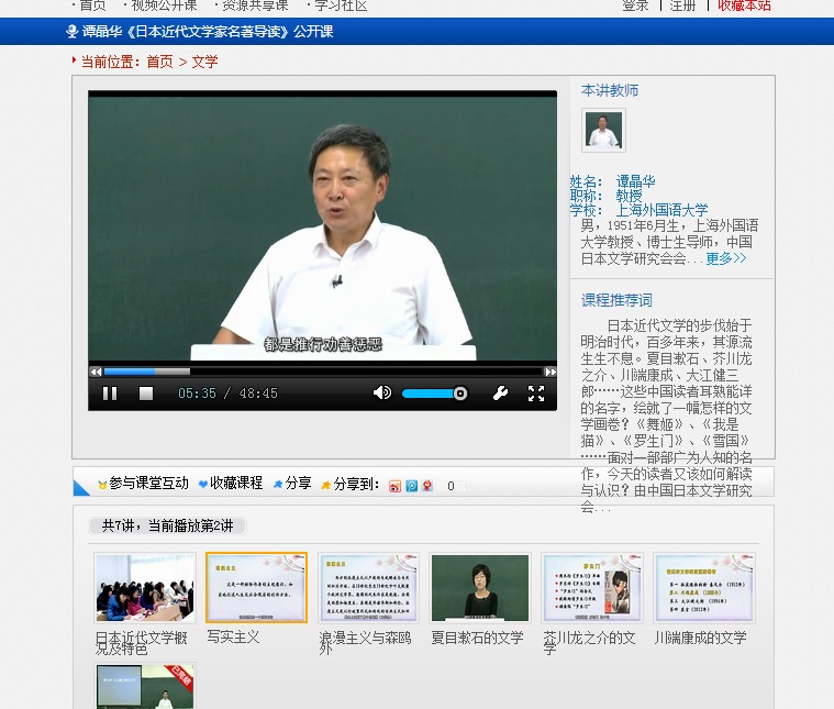 《日本近代文学家名著导读》视频公开课共包含7讲内容:1.日本近代文学概论;2.写实主义(坪内逍遥与二叶亭四迷);3.浪漫主义与森鸥外;4.夏目漱石的文学;5.芥川龙之介的文学;6.川端康成的文学;7.大江健三郎的文学。其中谭晶华教授主讲第1、2、3、6讲;高洁副教授主讲第4和第5讲;徐旻副教授主讲第7讲。