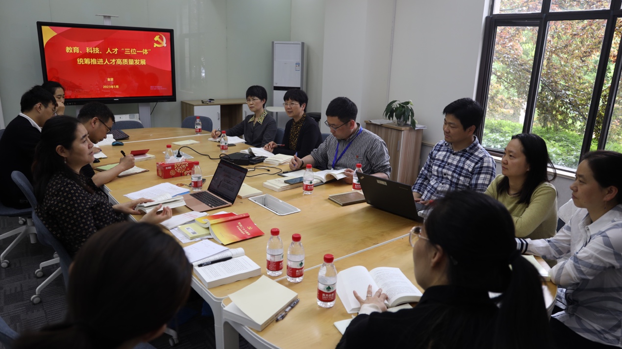 金慧结合阅读《习近平著作选读》第一二卷、《习近平新时代中国特色社会主义思想专题摘编》等文献,带领大家学习了习近平总书记关于教育、科技、人才“三位一体”统筹推进高质量发展等重要论述的原文,交流了自己的学习体会。