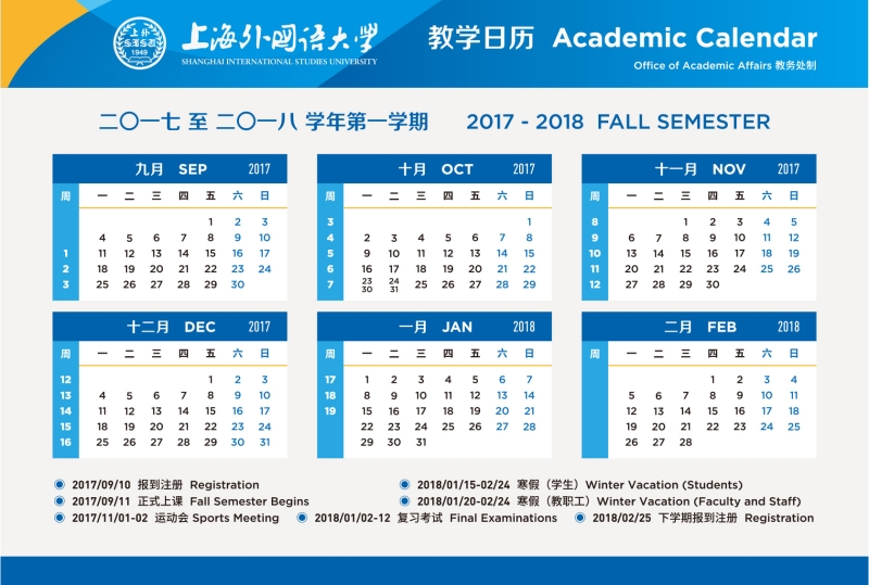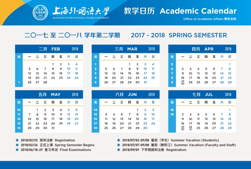 上外办〔2017〕37号 签发人:杨力 关于2018年放假安排的通知 各单位: 为方便师生员工安排相关业务,根据2017年11月30日发布的《国务院办公厅关于2018年部分节假日安排的通知》(国办发明电〔2017〕12号),结合我校校历安排和教学实际情况,决定将2018年放假做如下安排: 一、元旦:1月1日(星期一)放假,与周末连休。 二、春节:2月15日至21日仍在我校寒假假期中,无需另作安排。 三、清明节:4月5日(星期四)至7日(星期六)放假调休,共3天。4月8日(星期日)正常上班上课,安排星期五的教学工作。 四、劳动节:4月29日(星期日)至5月1日(星期二)放假调休,共3天。4月28日(星期六)正常上班上课,安排星期一的教学工作。 五、端午节:6月18日(星期一)放假,与周末连休。 六、中秋节:9月24日(星期一)放假,与周末连休。 七、国庆节:10月1日(星期一)至7日(星期日)放假调休,共7天。9月29日(星期六)、9月30日(星期日)正常上班上课。9月29日安排星期四的教学工作,9月30日安排星期五的教学工作。 放假期间,各单位需妥善做好领导值班安排,处置意外、突发事件,并请做好防火、防盗、防汛等安全防范工作。寒、暑期各单位仍实行值班制度,处理日常事务,相关值班要求另文发布。若年内因特殊情况,放假安排有所调整,将另行发文通知。 特此通知。 开云电竞注册流程 2017年12月12日