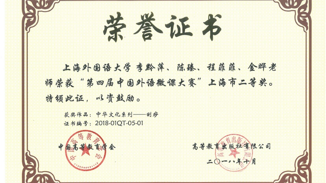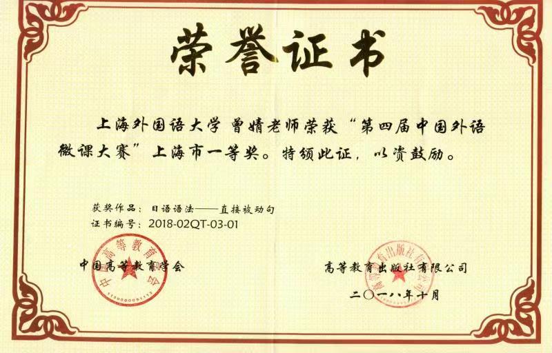 经校内推荐、上海市复赛、全国决赛层层选拔,我校日本文化经济学院曾婧老师的微课作品《日语语法——直接被动句》获第四届中国外语微课大赛日俄德法语组全国二等奖、上海市一等奖;国际文化交流学院李黔萍老师团队作品《中华文化系列——刮痧》获本科英语组上海市二等奖。