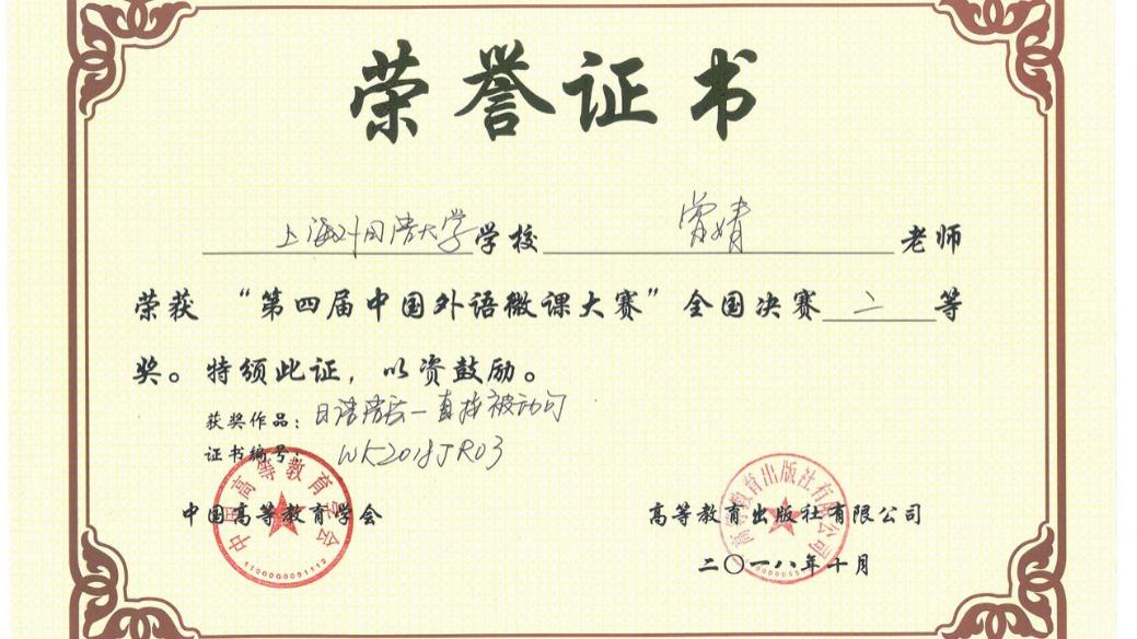 经校内推荐、上海市复赛、全国决赛层层选拔,我校日本文化经济学院曾婧老师的微课作品《日语语法——直接被动句》获第四届中国外语微课大赛日俄德法语组全国二等奖、上海市一等奖;国际文化交流学院李黔萍老师团队作品《中华文化系列——刮痧》获本科英语组上海市二等奖。