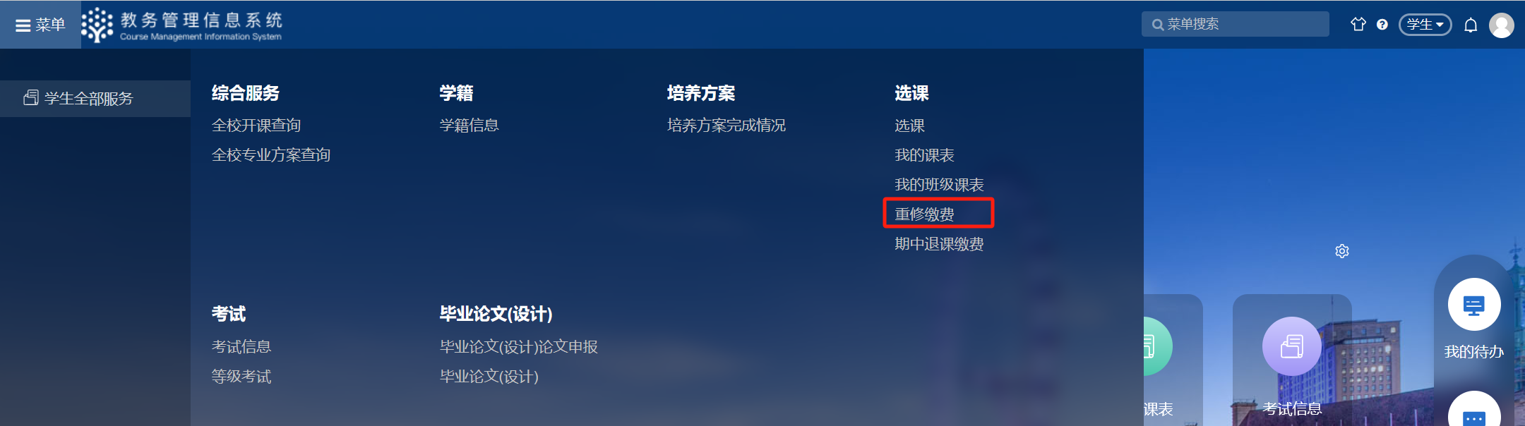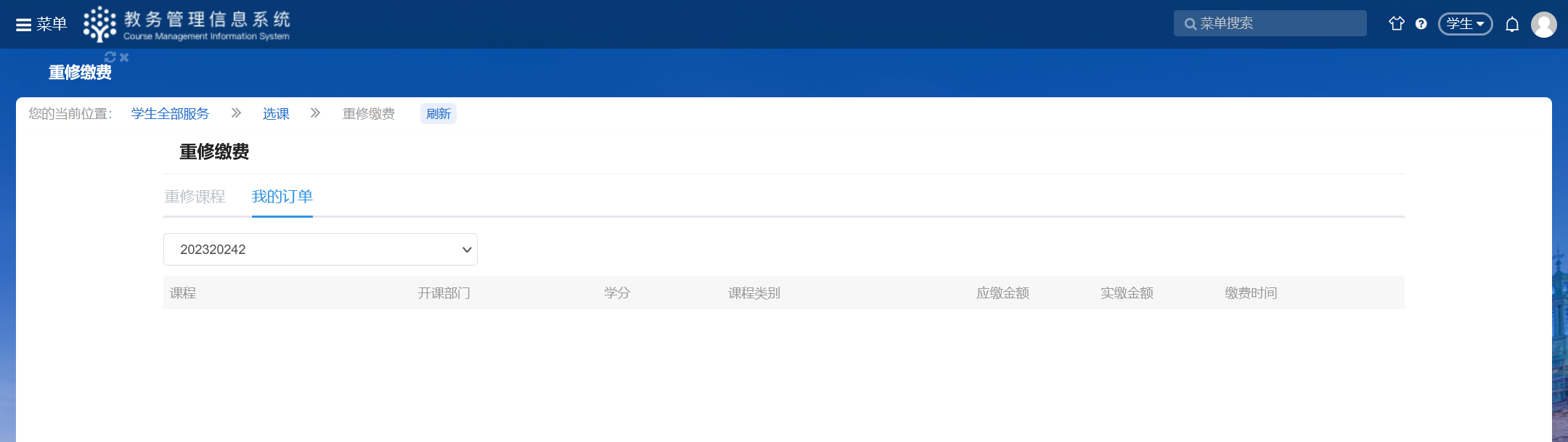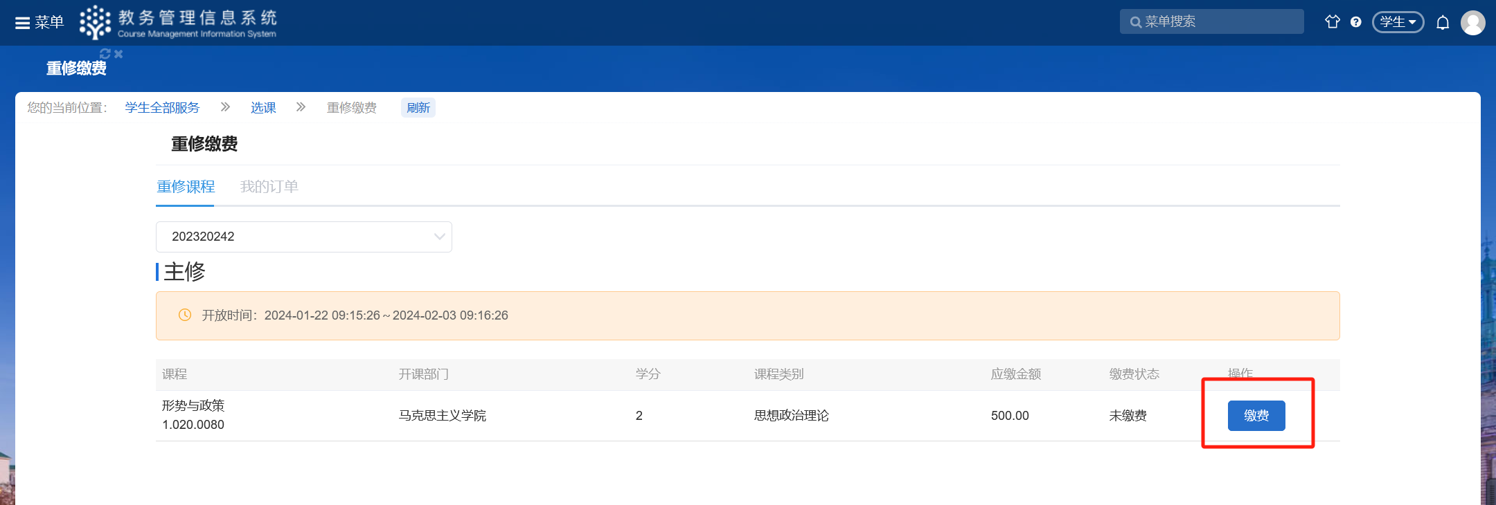 2023-2024学年第二学期本科生重修预选课已结束,现根据安排启动重修缴费工作。请注意:重修必须完成缴费才能成立。