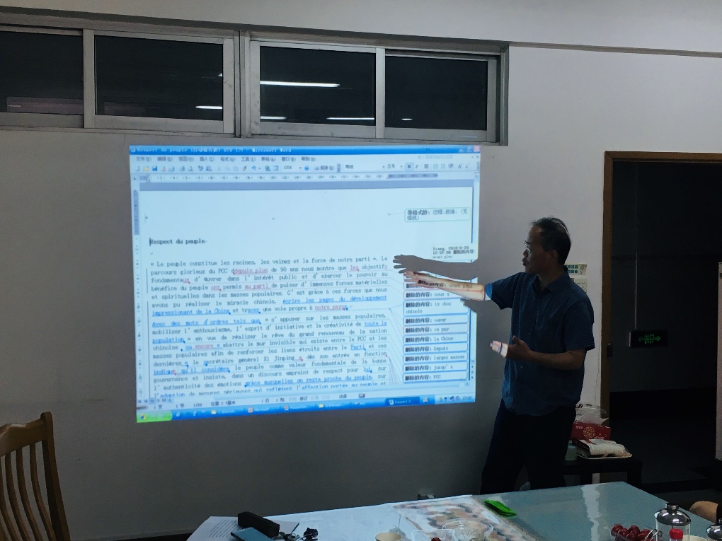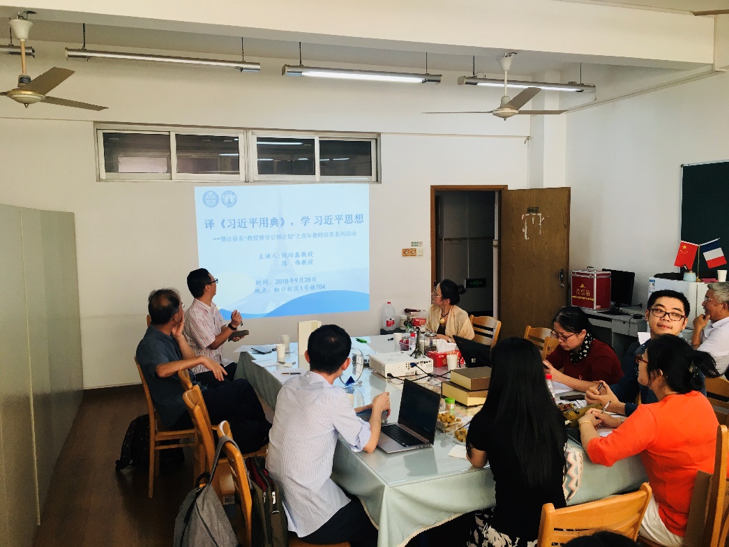 2018年9月28日下午,法语系博导钱培鑫教授和陈伟教授以翻译《习近平用典》外译项目的过程体会为主旨,将思政教育与教学科研工作有机结合,在全系展开《习近平用典》翻译学习分享会,对其现实意义和背景义理进行解读、阐释,引导青年教师树立“课程思政”理念,深入推进法语系课程思政开云体育平台下载安装改革。