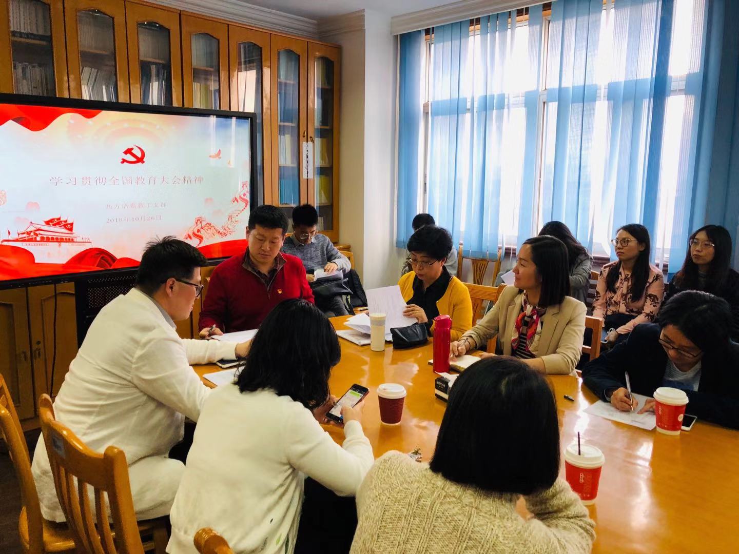 2018年10月,西方语系组织全系教师学习教育部本科教育工作会议相关文件,关注“里瑟琦科教观察”等微信公众号,通过文本学习和新媒体学习多渠道结合的方式,深入学习贯彻本科教育工作会议精神。2018年10月26日,全系开展“聚焦新时代教育的新任务”专题学习,集中研讨,进一步提高认识、更新观念,明确学校人才培养的目标定位和振兴本科教育的思路举措。