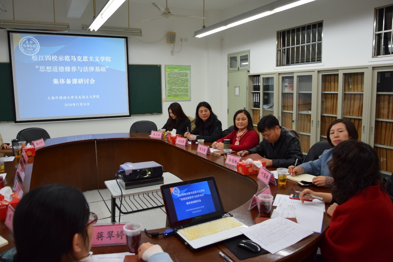 第四、不仅加强教研室集体备课,而且松江四所高校示范马院的各门课程教师开展集体研讨、备课,互相切磋,取长补短,教师教学水平有很大提高。宫维明老师在2018年度上海市青年教师教学竞赛决赛中荣获三等奖。新教师孙志伟参加上海教育电视台组织的“空中课堂”,进行公开宣讲,取得良好的社会反响。