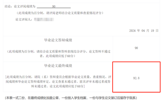 系统中,论文评阅书中两位评阅人评阅信息会以审核流形式呈现在评阅书中,无需签名。论文评阅书可由院系管理员从系统中批量导出并下载,由院系根据本院系各专业本科毕业论文工作细则安排后续打印及纸质版存档事宜。在系统论文模块“论文终稿”环节中,无需再次提交评阅书扫描件,需要评阅书信息时,可以通过系统对应抓取。在纸质版归档时(一式两份,一份放入学生档案,一份与学生论文装订后留存院系),须在毕业论文最终成绩处加盖院系公章,具体位置见下图(图1)红框所示。