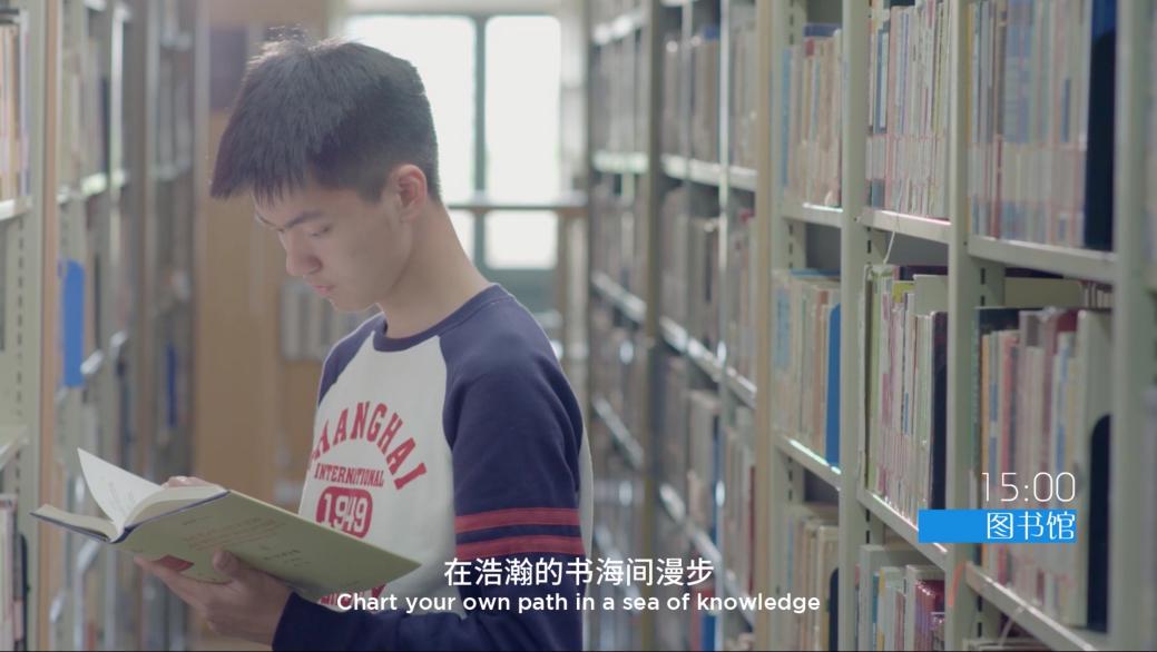 图2:周浚哲在图书馆看书(来源:上外招生宣传片《成就你的选择》)