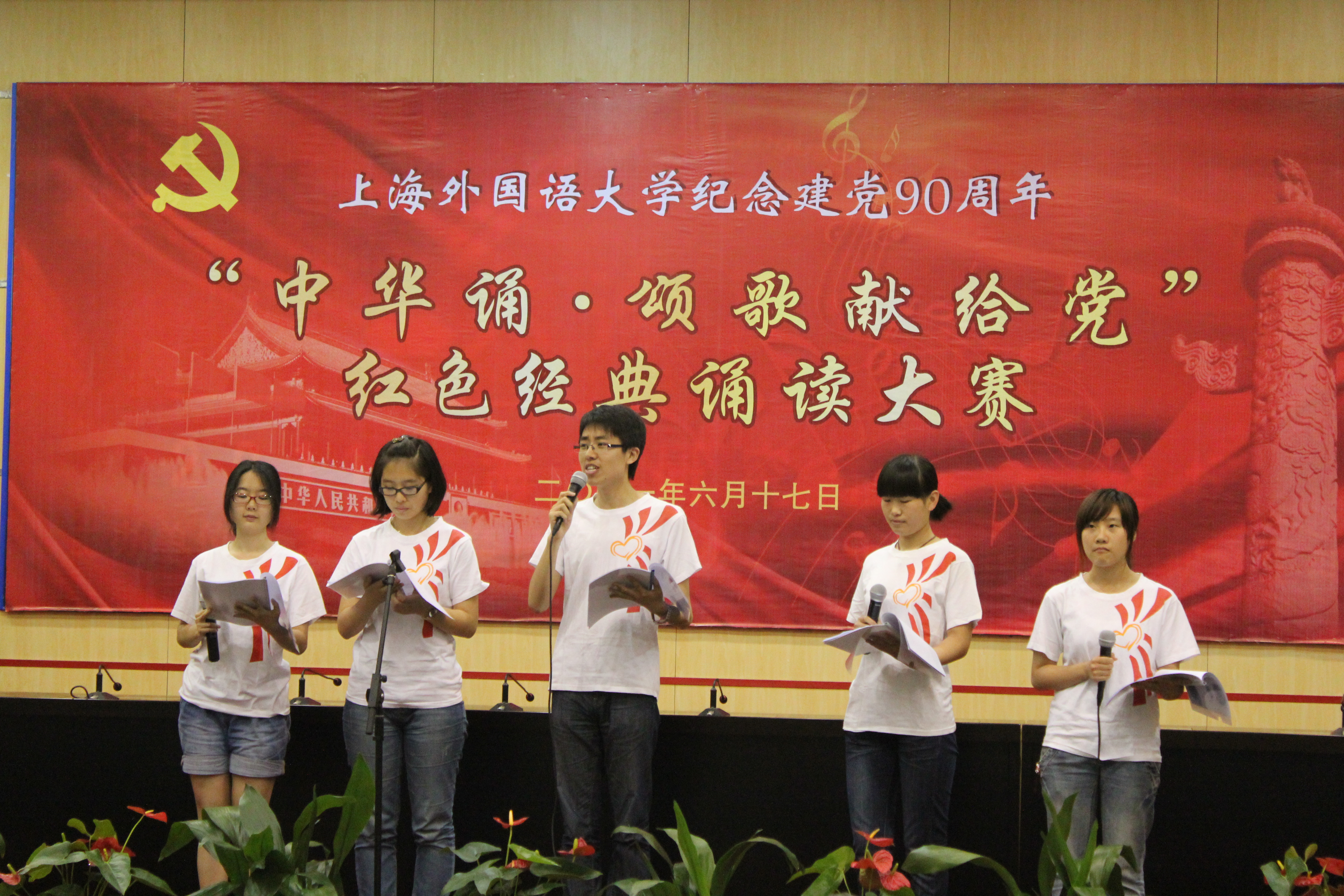 纪念建党90周年“中华诵•颂歌献给党”红色经典诵读大赛于2011年6月17日(周五)下午13:00在我校虹口校区会议中心第一报告厅举行。本次大赛由校语言文字工作委员会主办,副校长冯庆华、张峰、杨力、周承以及校语委全体成员和院系教师、学生代表出席观摩了大赛。来自各院系、机关部处的19组教师和学生选手饱含深情的诵读向我们展示了我党90年的光辉历程和不朽业绩。 “中华诵•颂歌献给党”红色经典诵读大赛是我校以建党90周年为契机,以诗文诵读的方式教育引导师生深刻认识历史和人民是怎样选择了中国共产党、选择社会主义道路,进一步激励广大教育工作者和青少年更加紧密地团结在以胡锦涛同志为总书记的党中央周围,勤奋工作,刻苦学习,为实现中华民族伟大复兴而不懈奋斗。 冯庆华副校长为本次大赛致辞,他说:“中国共产党自1921年成立以来,始终以实现中华民族伟大复兴为己任,团结带领各族人民在革命、建设、改革事业中取得了举世瞩目的伟大成就。组织开展纪念建党90周年活动,是教育系统2011年工作的一项重要内容。” 市语协副会长过传忠代表评委进行点评。他充分肯定了各位选手的总体表现,并就诵读过程中语音、节奏、气息等的运用进行了指导。 经校内外专家组成的评委会的认真评选,西方语系的陈颖获得本次诵读大赛一等奖,国际金融贸易学院的赵春萌和国际工商管理学院的杨璧侨获得二等奖,英语学院孙艳、西方语系沈佳茜、图书馆张绍铎获得三等奖。(校语言文字工作委员会)