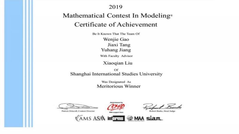 近日,上外国际金融贸易学院2018级会计学专业学生高文杰、蒋雨航及其合作者唐嘉希在刘晓倩老师的指导下喜获美国大学生数学建模竞赛一等奖。