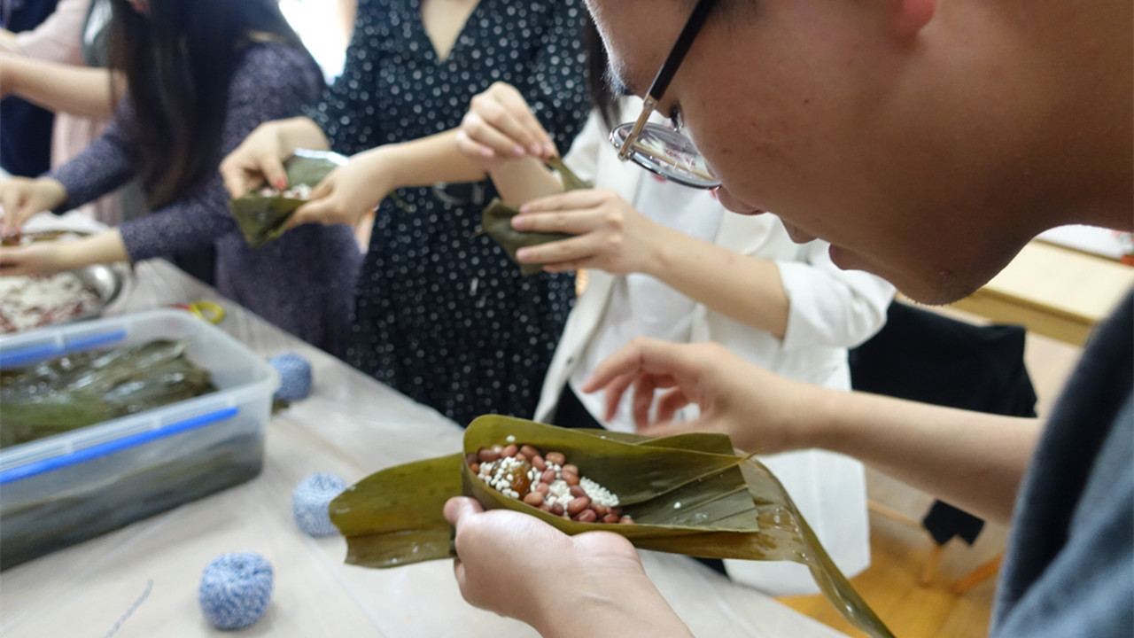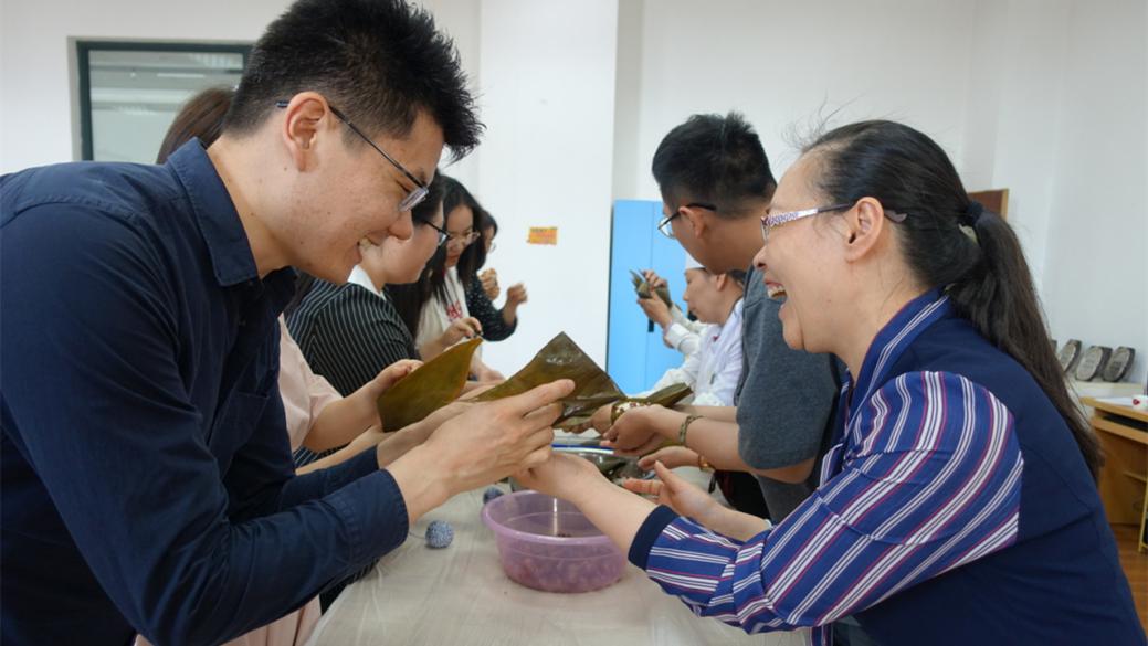 因中国的传统佳节端午将近,诗会结束后,社团还邀请来了松江后勤食堂的大师傅教青年教师们包粽子。粽子作为中华民族传统节庆食物之一,早在春秋之前就已出现,上外的青年教师们通过学习制作粽子这种美食,既提高了动手能力也是对于中华民族优秀文化的传承。