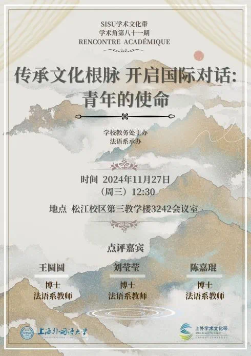 SISU学术角第八十一期活动由教务处主办,法语系承办,以“传承文化根脉,开启国际对话:青年的使命”为活动主题,将于2024年11月27日12:30准时开启!本期活动将由法语系四年级九名同学分享其近期在学术上的思索与研究成果,邀请王圆圆老师、刘莹莹老师和陈嘉琨老师担任嘉宾点评,旨在培养同学们的思辨能力与学术表达能力,进一步培育院系学生学术氛围。