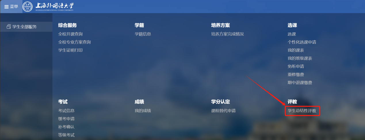 登录教务系统(https://jw.shisu.edu.cn/home),右上角菜单——学生全部服务,选择“学生总结性评教”。
