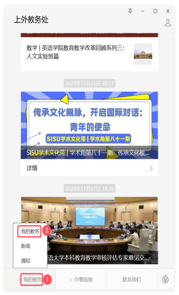 微信打开上外教务处公众号,点击左下角我的教务,点击统一身份认证登录,输入用户名与密码后,登录移动端,按下图操作进行评教。
