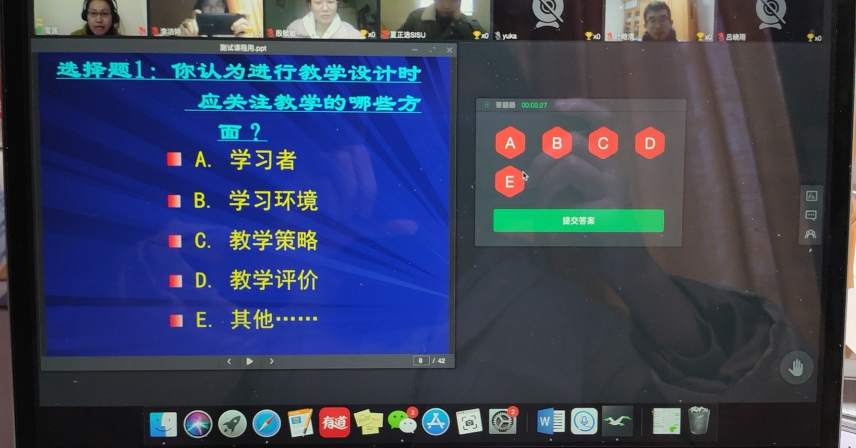 不能否认,在线直播虽然克服了地域空间的限制,但有时却也不比教室面授来得生动和鲜活。例如,教室里,老师讲授过程中丰富的肢体语言可以成为提示学生思考的线索,甚至在教室里的来回走动也会对学生的课堂投入产生影响。但在直播间,虽然有板书和PPT等资源辅助教学,但只有头像和声音的老师对学生能够施加的影响仍然受限很多。因此,通过多种方式的互动激发学生认知参与,“刷一刷”师生彼此的“存在感”就显得很有必要了。知识抢答,选择题设计,掷骰子提问,学生在线Pre分享等互动方式,都可以在一定程度上有效活跃直播间的氛围,激发同学们在线学习的投入热情。
