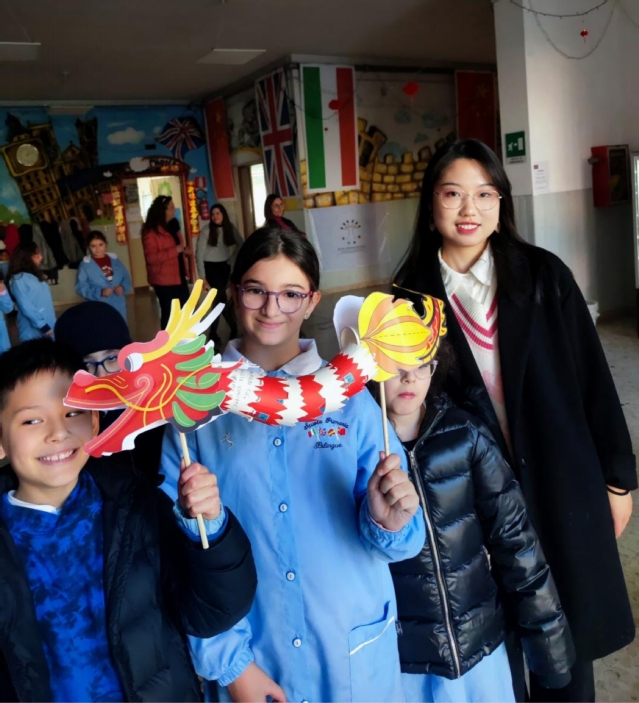 我的教学地点在孔院下设的意大利贝内文托双语小学孔子课堂,每周我需要乘坐大巴车跨市往返,那里地处山区,生活和教学条件相对简陋,但孩子们的热情却无比高涨。面对活泼好动的小学生,课堂秩序管理成为了我的一大挑战。为了让孩子们集中注意力,我每天都花很多心思设计趣味活动与游戏,如“声东击西”词汇游戏、“过马路”情境对话练习和“生词转盘”随机问答等,在游戏中,学生的专注力明显提高了,课堂管理省下了不少精力。