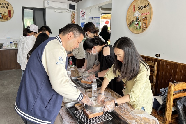 习近平总书记指出:“劳动最光荣、劳动最崇高、劳动最伟大、劳动最美丽。”24名师生在当地村民的指导下,亲手制作松江传统米糕和塌饼,米香阵阵,笑声融融,一块块糕点在指尖逐步完成,大家享受着劳动带来的最简单质朴的快乐。随后大家走访“荡里·有米”社区,在感受“阡陌交通,鸡犬相闻”的乡村惬意中,了解农家土灶菜饭的制作过程,品尝大米汽水、米奶茶、米露等大米深加工创意产品,感受丰收的辛劳与满足。