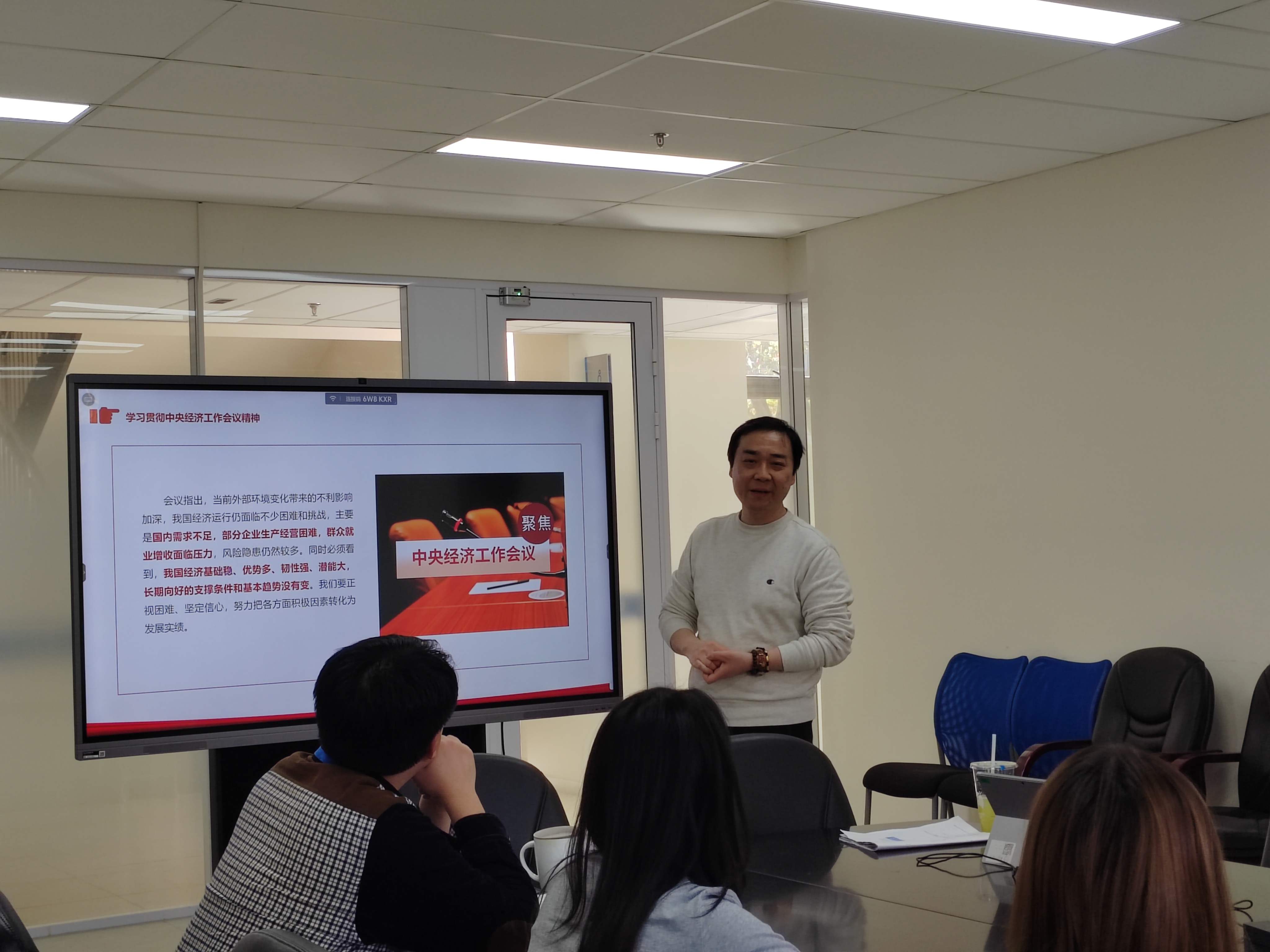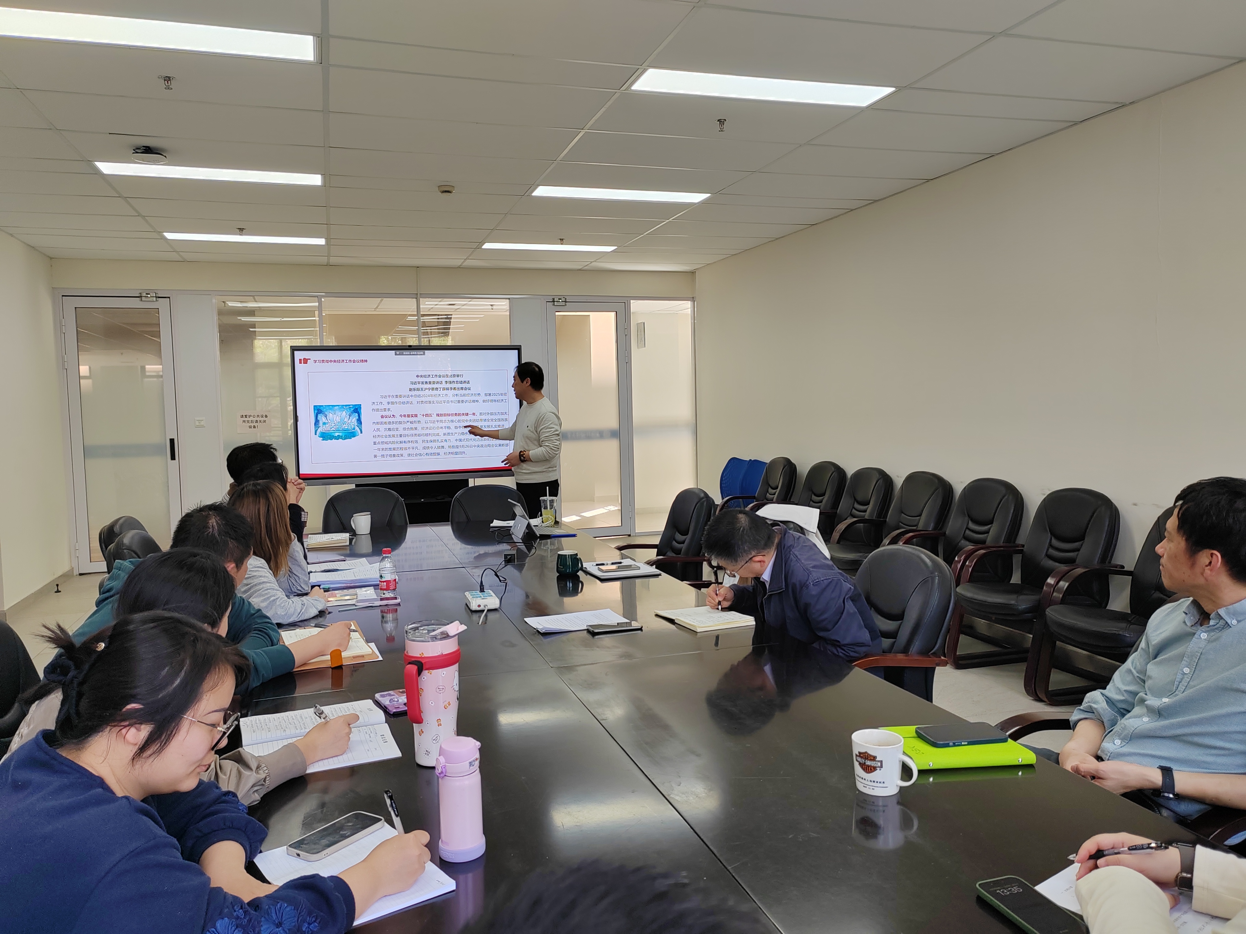 会议开始,沈坚副处长带领大家学习中央经济工作会议精神。他提到,会议总结了2024年的经济工作,分析了当下经济形势,还对2025年经济工作做了安排。虽然过去一年经济发展遇到不少困难,但在党中央的领导下,还是取得了不少成绩。现在经济发展仍然面临一些难题,像国内需求不够、部分企业经营不好等,但我国经济基础好、有韧性,长期向好的趋势没有变。