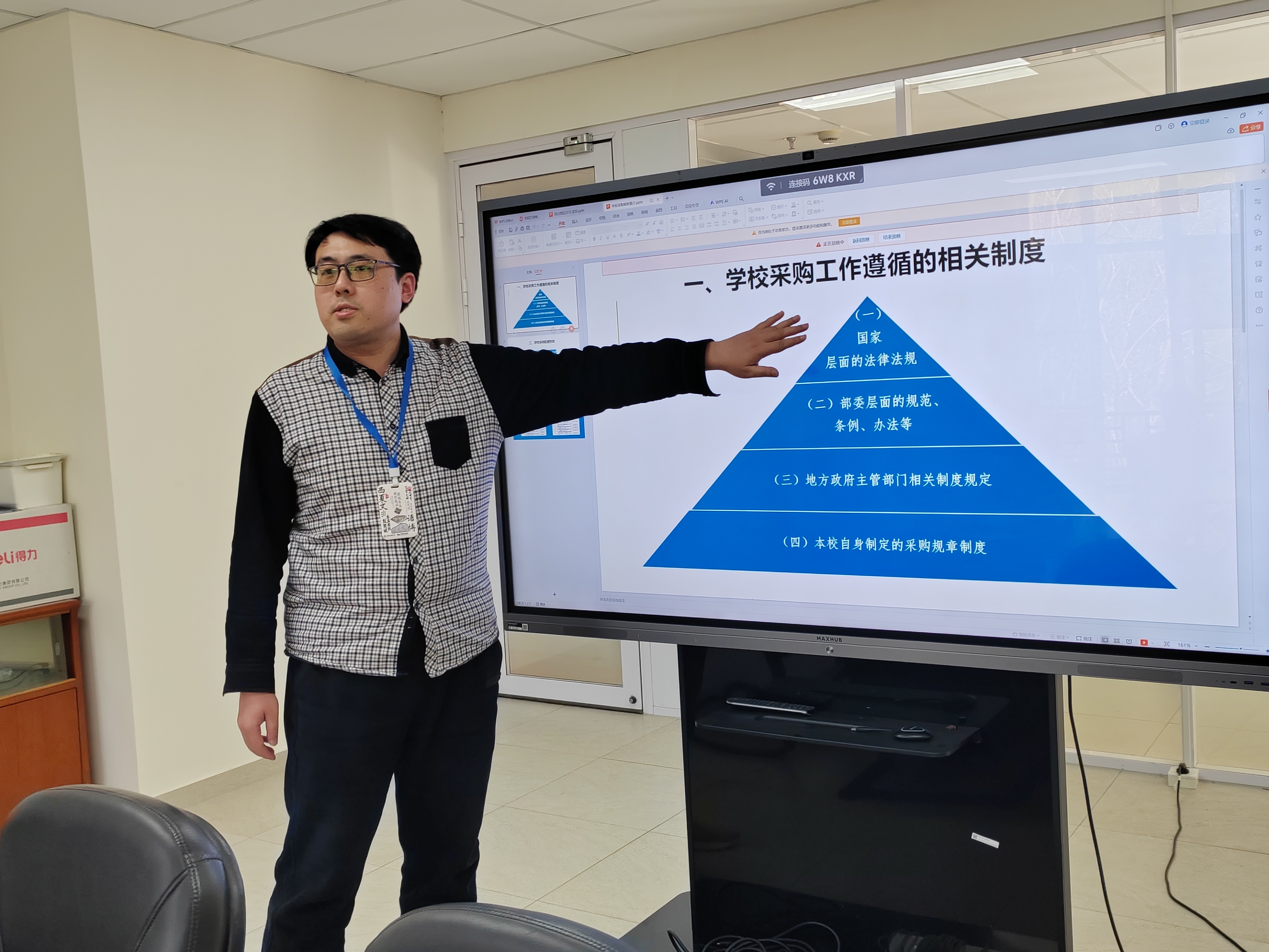 随后,国资处招标科科长徐颖健开展制度领学环节。其详细介绍了学校现行采购与招标工作领域相关制度建设及文件拟制的基本情况。按照国家、学校、属地等分类介绍了采招工作制度和规范的构成,阐述了国家《政府采购法》与《招标投标法》的侧重点、关联性和两者的法律地位和关系,并进一步就学校采购管理办法、分散采购管理办法、招标投标管理办法和科研仪器设备采购管理办法等校级采购规章制度的相关要点和重点环节做了说明。最后,他指出随着时间推移和上位法的不断更新,国资处招标科在处领导的指导和帮助下也在积极的对学校采购制度进行必要的修订更新,确保其能与时俱进、持续完善,从而更好的推动我校采购招标工作规范、高效开展,为广大师生和学校发展提供更好、更优质的服务。