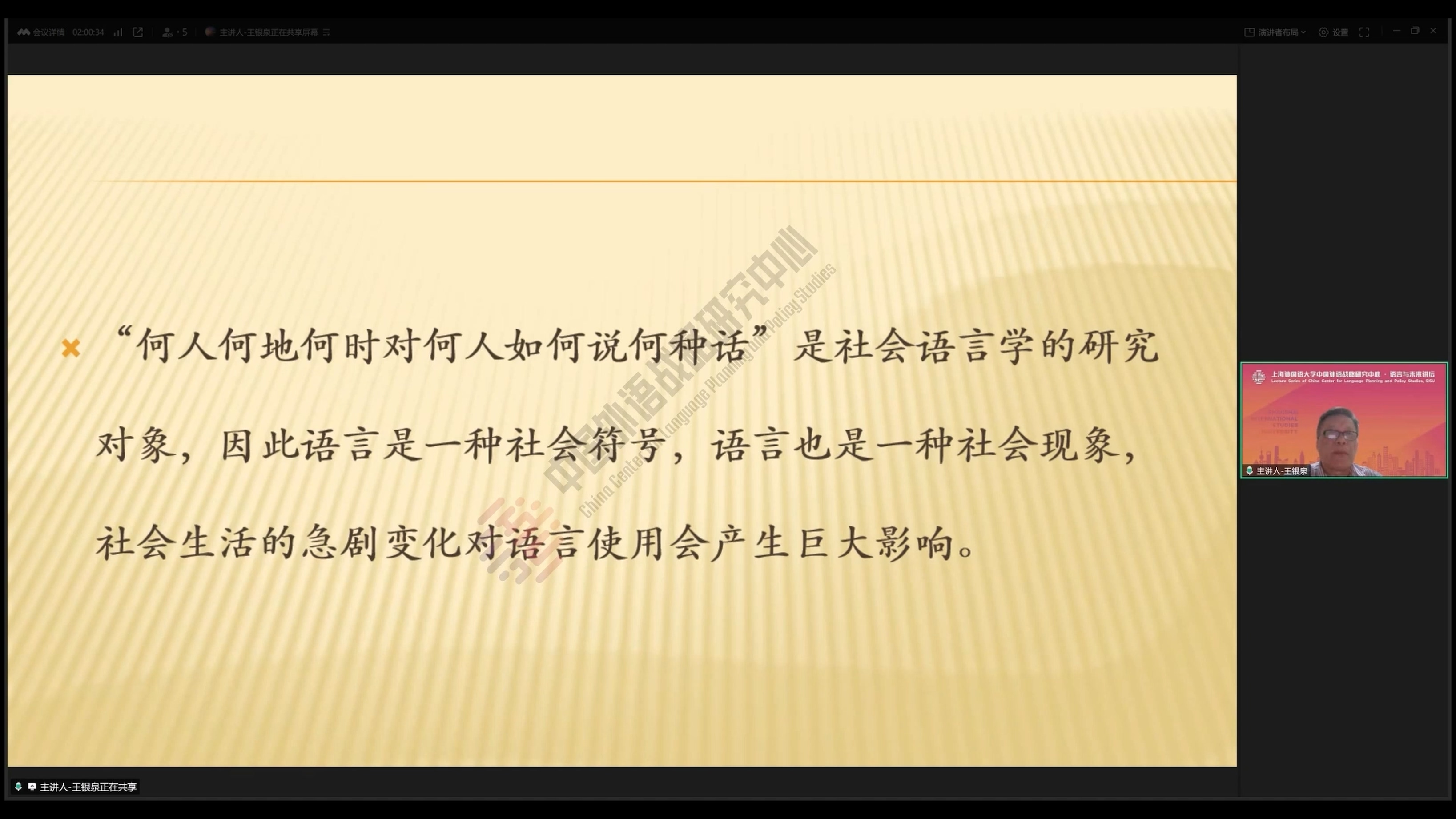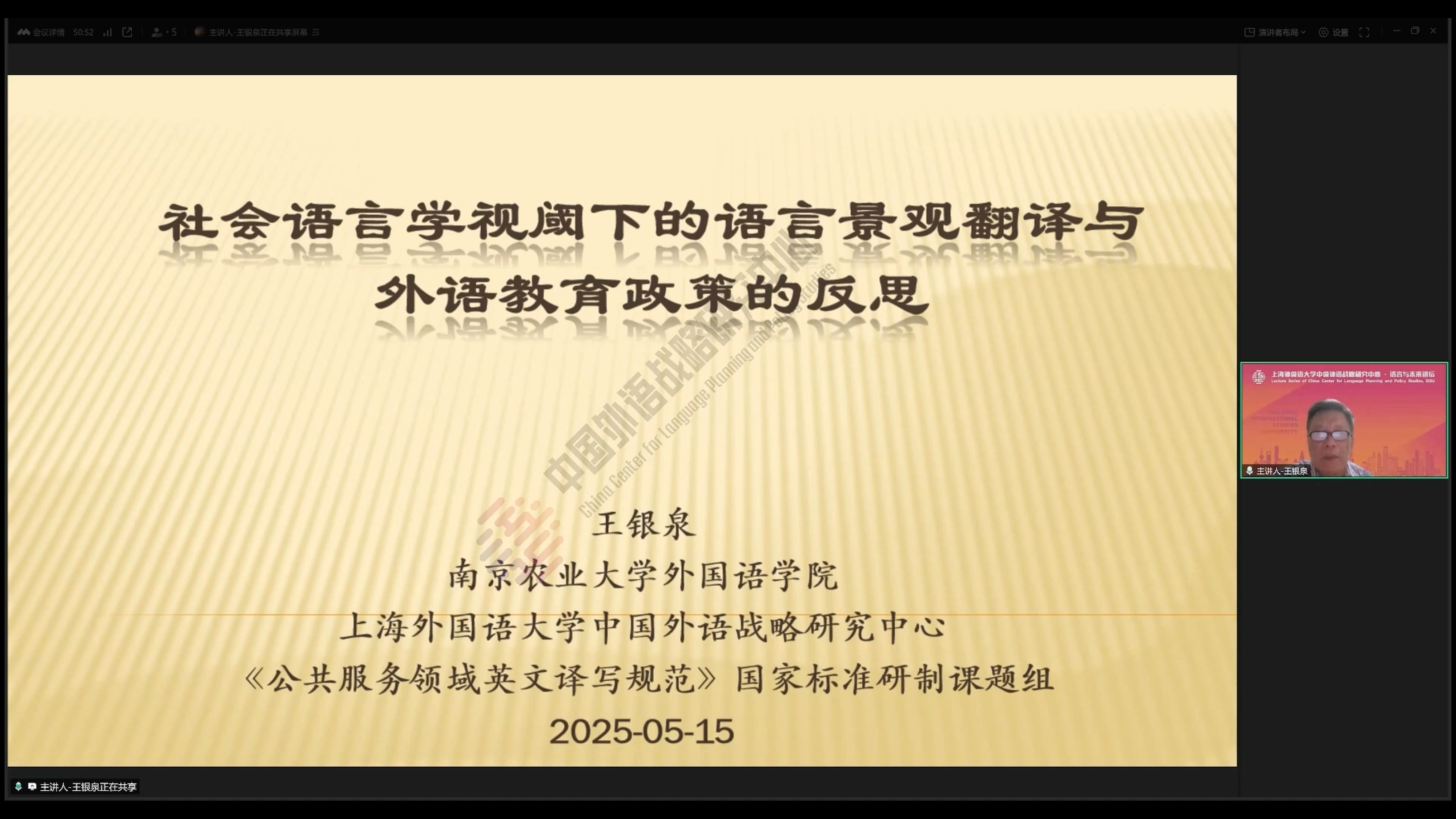 2025年5月15日,南京农业大学王银泉教授做客中国外语战略研究中心“语言与未来讲坛”,做了题为《社会语言学视域下的语言景观翻译与外语教育政策反思》的学术讲座。本次讲座由开云电竞注册流程中国外语战略研究中心副主任余华副教授主持,数百名师生线上参加了本次讲座。