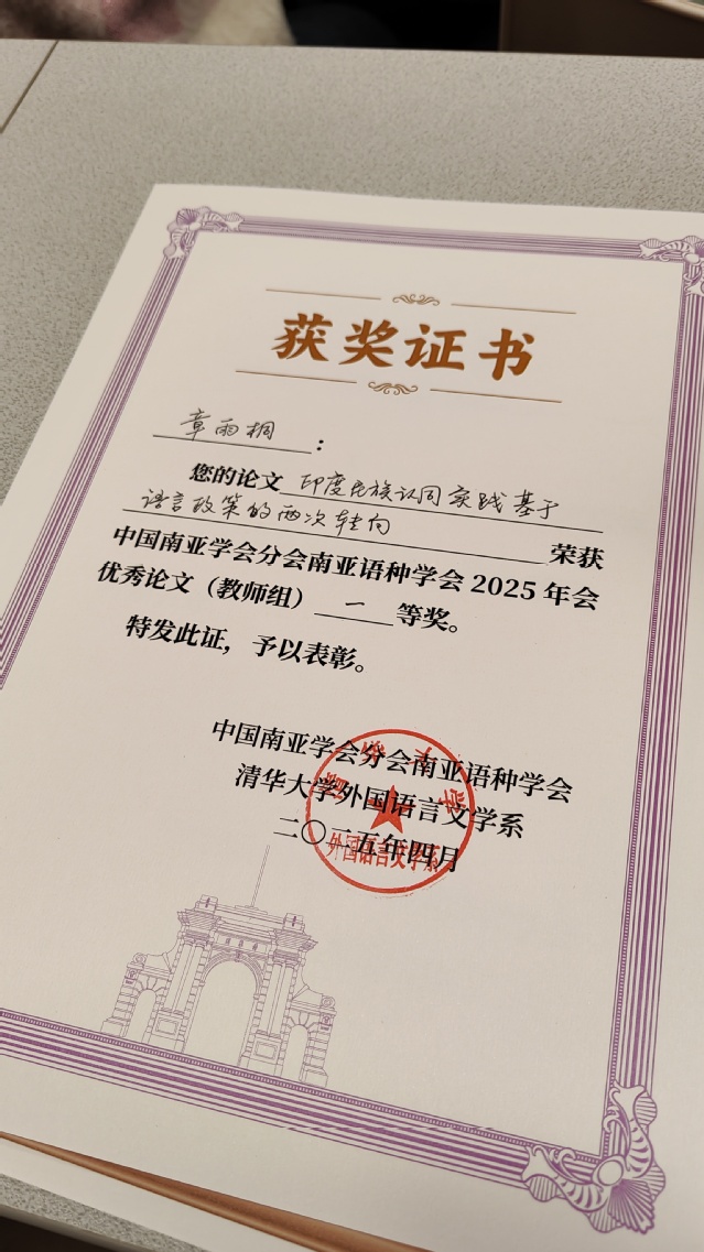 年会的闭幕式上,除了常务理事聘书授予仪式外,南亚语种学会会长,清华大学外国语言文学系姜景奎教授还为本次年会提交论文的获奖者颁发了证书。章雨桐老师的论文《印度民族认同实践基于语言政策的两次转向》在此次教师组参赛论文中荣获了一等奖。
