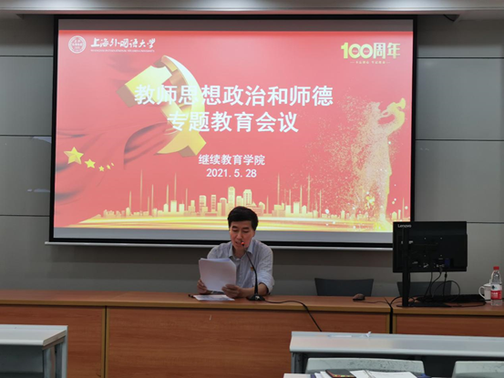 为贯彻落实教育部和学校对教师思想政治和师德师风工作的要求,推进学院教师思想政治和师德师风建设,5月28日,继续教育学院召开了全院教师思想政治和师德师风专题教育会议。学院领导班子成员、各教研室主任和全体教职工参加会议。会议由院党总支副书记陈建培主持。