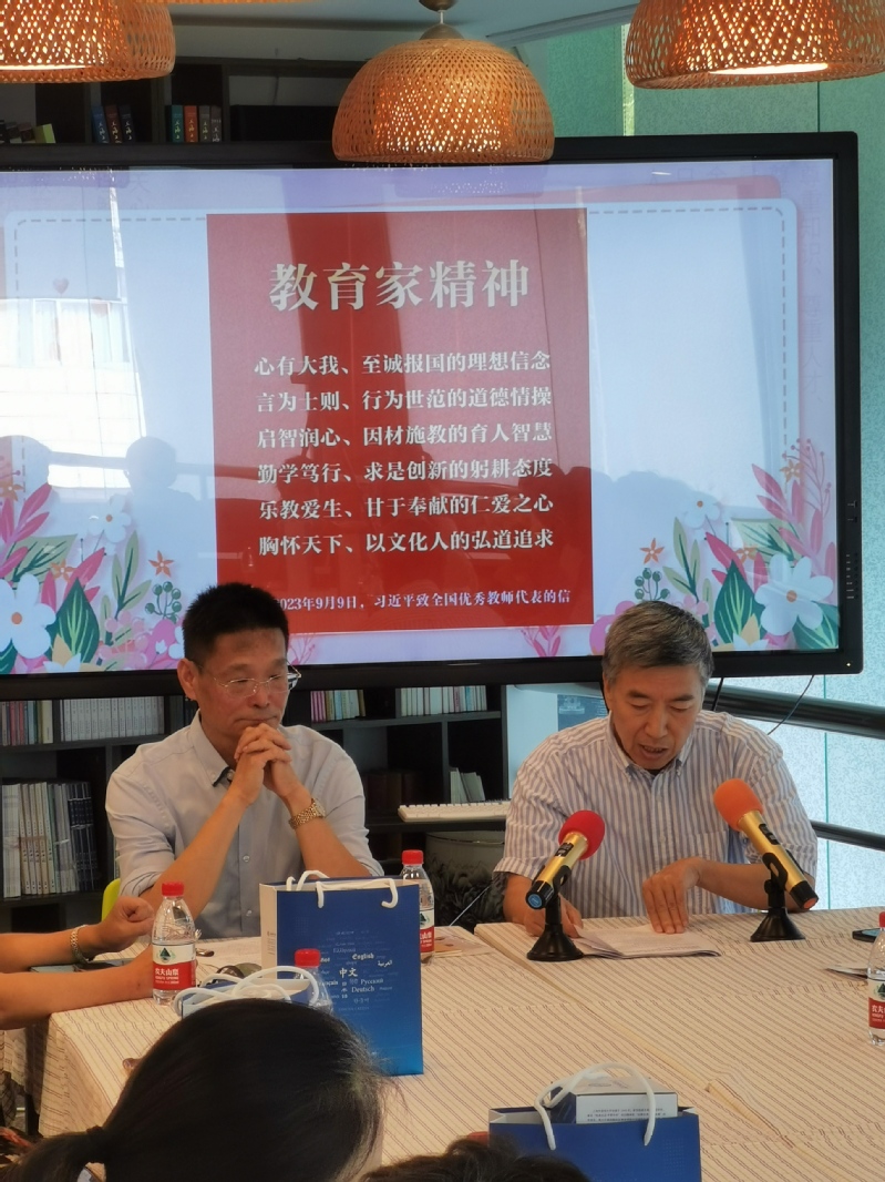 教师们对张琳老师多年来扎根边疆所付出的辛劳和在文化润疆方面做出的贡献表示敬意。党总支书记吴慧指出,张老师用自己的实际行动为新疆教育事业发展贡献力量,是全体教职工尤其是青年教师的学习楷模。她要求全体教师认真学习贯彻习近平总书记关于大力弘扬教育家精神的重要指示,学习、践行教育家精神,树立“躬耕教坛、强国有我”的志向和抱负,发扬援疆精神,坚持终身学习,不断提升师者境界,以培养堪当民族复兴大任的时代新人为己任,争做“四有”好老师和“四个引路人”,回答好“教育强国、上外何为”的时代问卷。