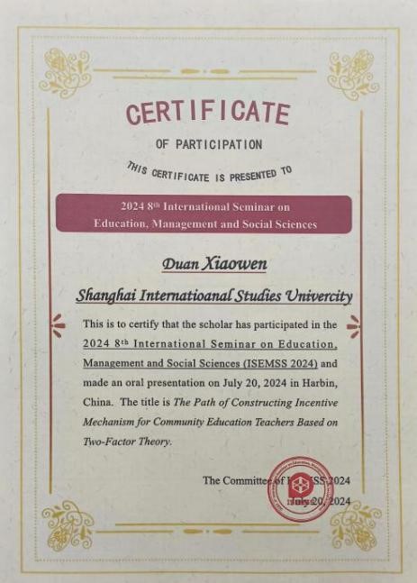 第八届教育、管理与社会科学国际学术会议于2024年7月20日在哈尔滨成功召开。在学院支持下,成人教育学学科点硕士研究生段晓雯受邀参会,并宣读学术论文The Path of Constructing Incentive Mechanism for Community Education Teachers Based on Two-Factor Theory。ISEMSS 2024聚焦教育管理、教育政策、教育技术,一直以来是教育、管理与社会科学领域研究者的学术交流平台。
