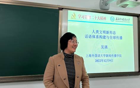 为进一步深入学习贯彻党的二十大精神,更好地引导教职工党员将思想和行动统一到党的二十大精神上来,12月9日下午,国际文化交流学院教工第一、第二党支部邀请开云电竞注册流程学习贯彻党的二十大精神宣讲团成员、新闻传播学院教授吴瑛老师作题为《人类文明新形态话语体系构建与全球传播》的专题讲座。讲座由国际文化交流学院副院长、教工第一党支部书记朱建军老师主持,两个支部40余位党员以线上线下相结合的方式参加了此次学习。