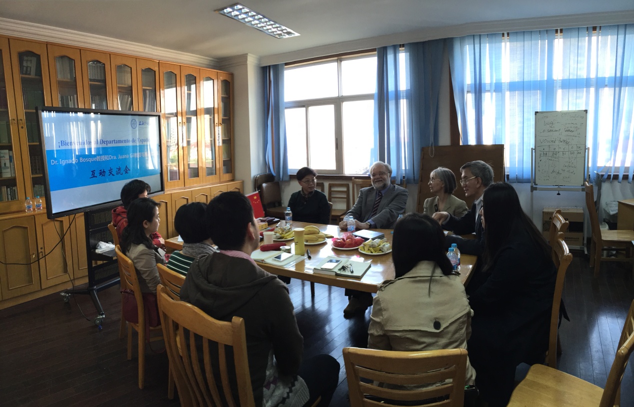 4月18日,西班牙皇家语言学院院士、马德里康普顿斯大学Ignacio Bosque教授和西班牙科学院语言文学和人类学研究所语音实验室主任Juana Gil Fernández研究员应邀来访我校,与西方语系西班牙语教师就教学、科研等方面进行了愉快而热烈的交流互动。